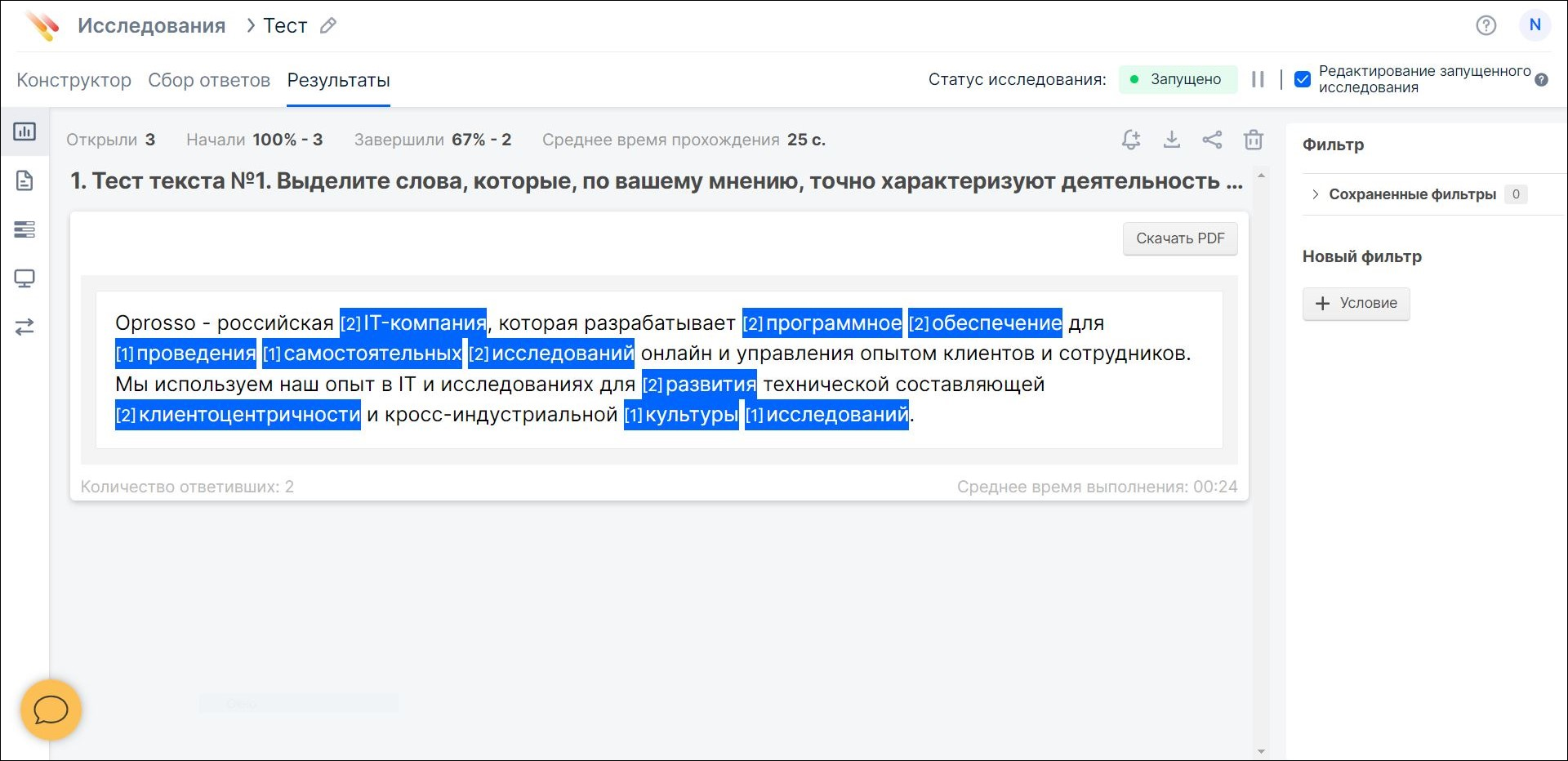 Полученные данные можно просмотреть в разделе «Результаты». По умолчанию первой откроется вкладка «Сводная статистика». В ней будет представлен тот же текст, что видели респонденты во время прохождения. Выделенные слова – выбор респондентов при выполнении задания. Число рядом с каждым из них – сколько раз слово было выбрано в течение исследования.
